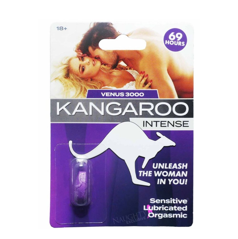 Kangaroo for Women Intense Venus 3000 está formulada para mejorar el placer femenino mediante aumento de la libido, sensibilidad y relajación. Presentación en tableta violeta. Tomar media o una tableta con 16 oz de agua 20 minutos antes de la actividad sexual. El efecto inicia con estimulación y puede durar hasta 72 horas.